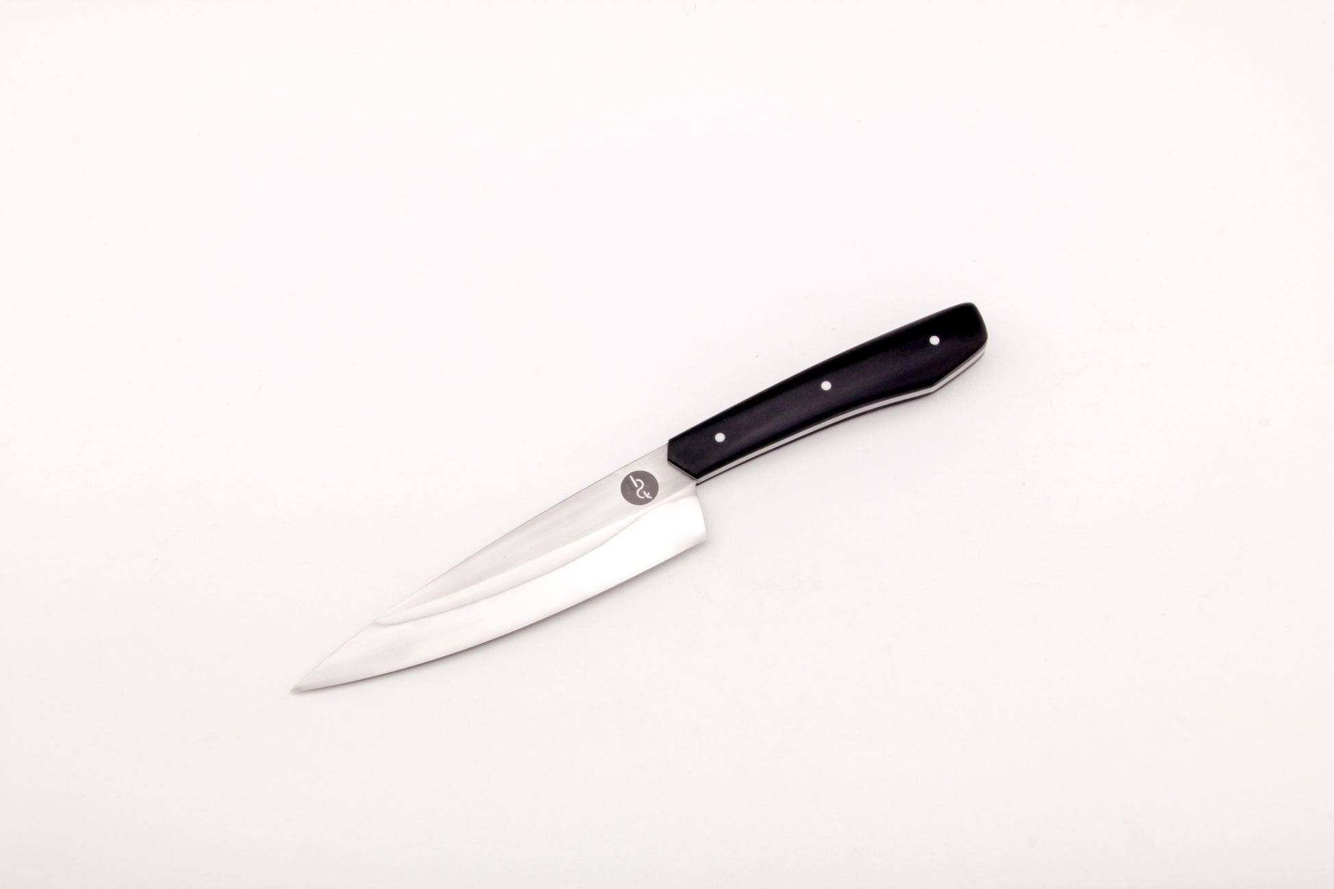 This 5.5" (140mm) Petty Knife is made from 26C3 high carbon steel and hardened using a differential heat treating method, and tempered to 62-64 HRC.